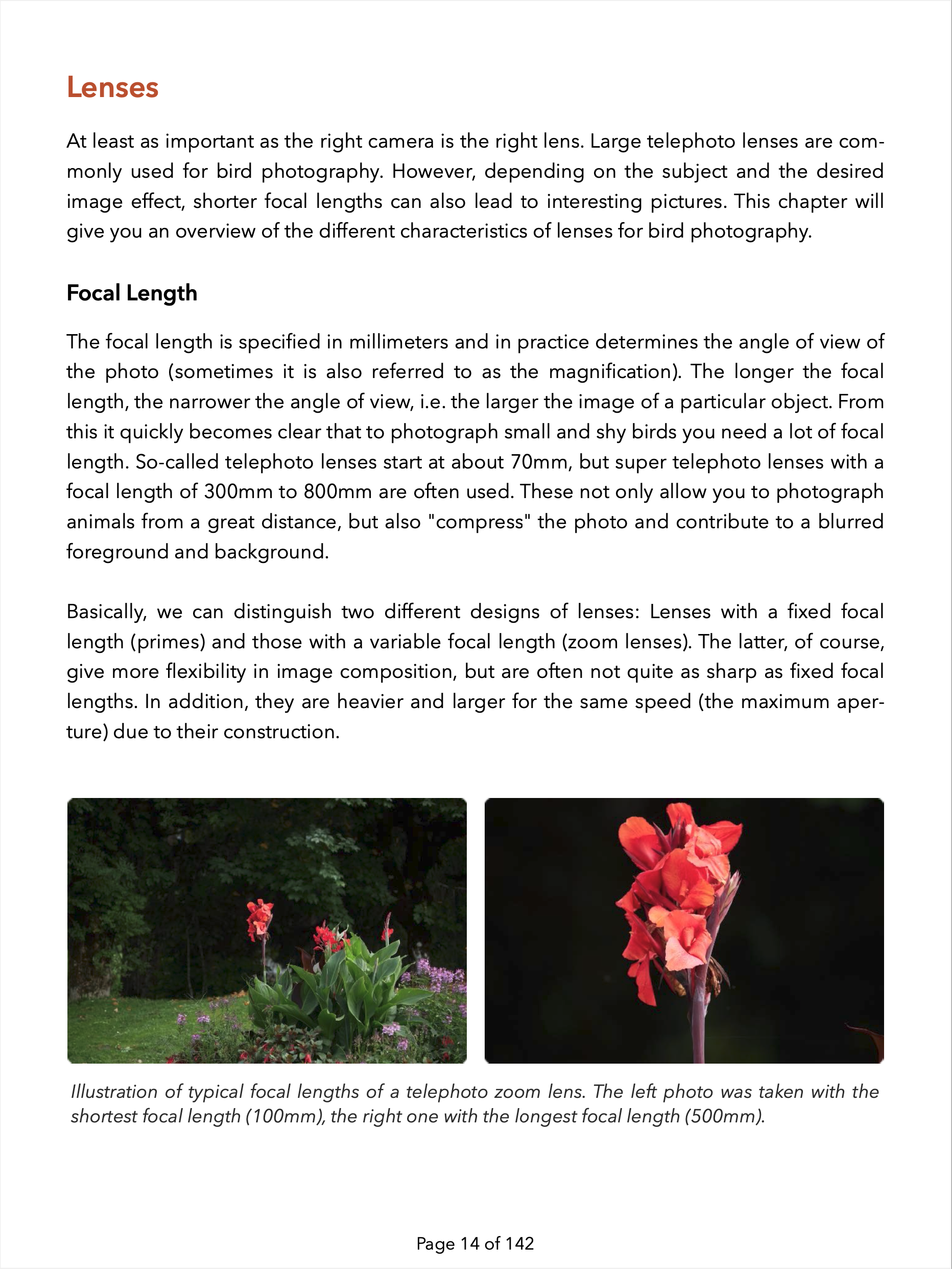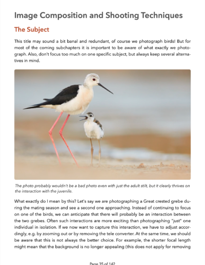 This e-book about bird photography is about the right equipment, different approaches, camera settings, image composition and much more. On over 140 pages, the individual topics are explained in a practical way and illustrated with examples. I am sure that you can benefit from many of the tips available in the book. In fact, there is a 60 days money-back guarantee!